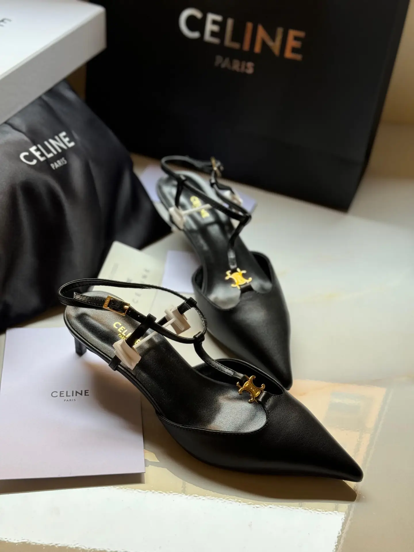 Every detail is considered, from the precise stitching and the subtle, embossed CELINE logo to the flawless finish that defines the house’s commitment to luxury. The sleek toe and flattering arch create an elongated line, offering a timeless aesthetic that transcends seasonal trends. Whether paired with tailored trousers for a sharp, contemporary look or a classic little black dress for an evening out, these heels are a definitive statement of refined power and effortless chic. Step into the zenith of luxury footwear.
