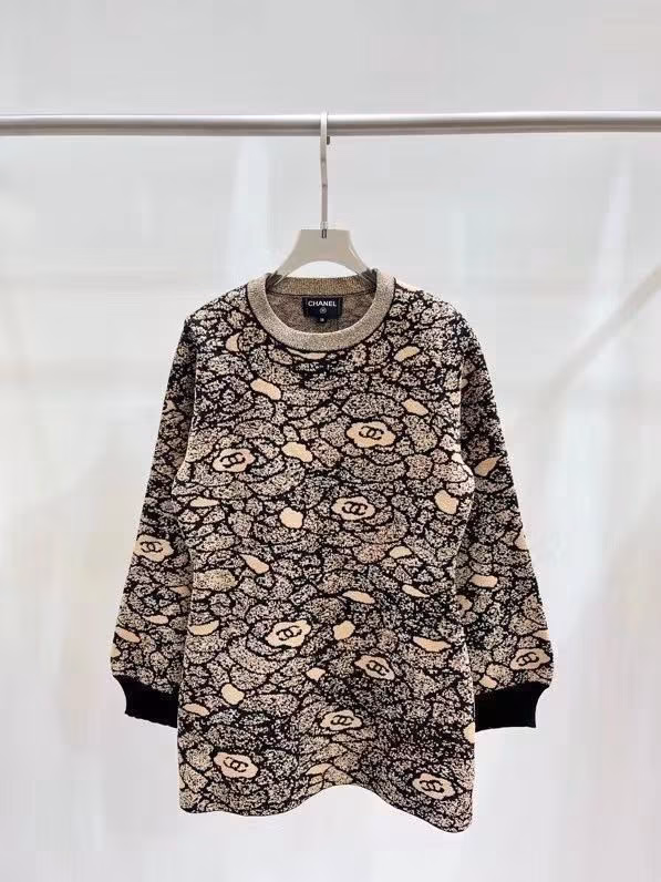 The sweater is distinguished by its intricate baroque-inspired motif, a signature of CHANEL’s love for classicism with a romantic twist. This complex pattern is woven with precision, creating a rich, textured canvas that is both tactile and visually captivating. Finished with the subtle, yet unmistakable, CC logo discreetly integrated into the design, it speaks to those with a connoisseur’s eye for detail.