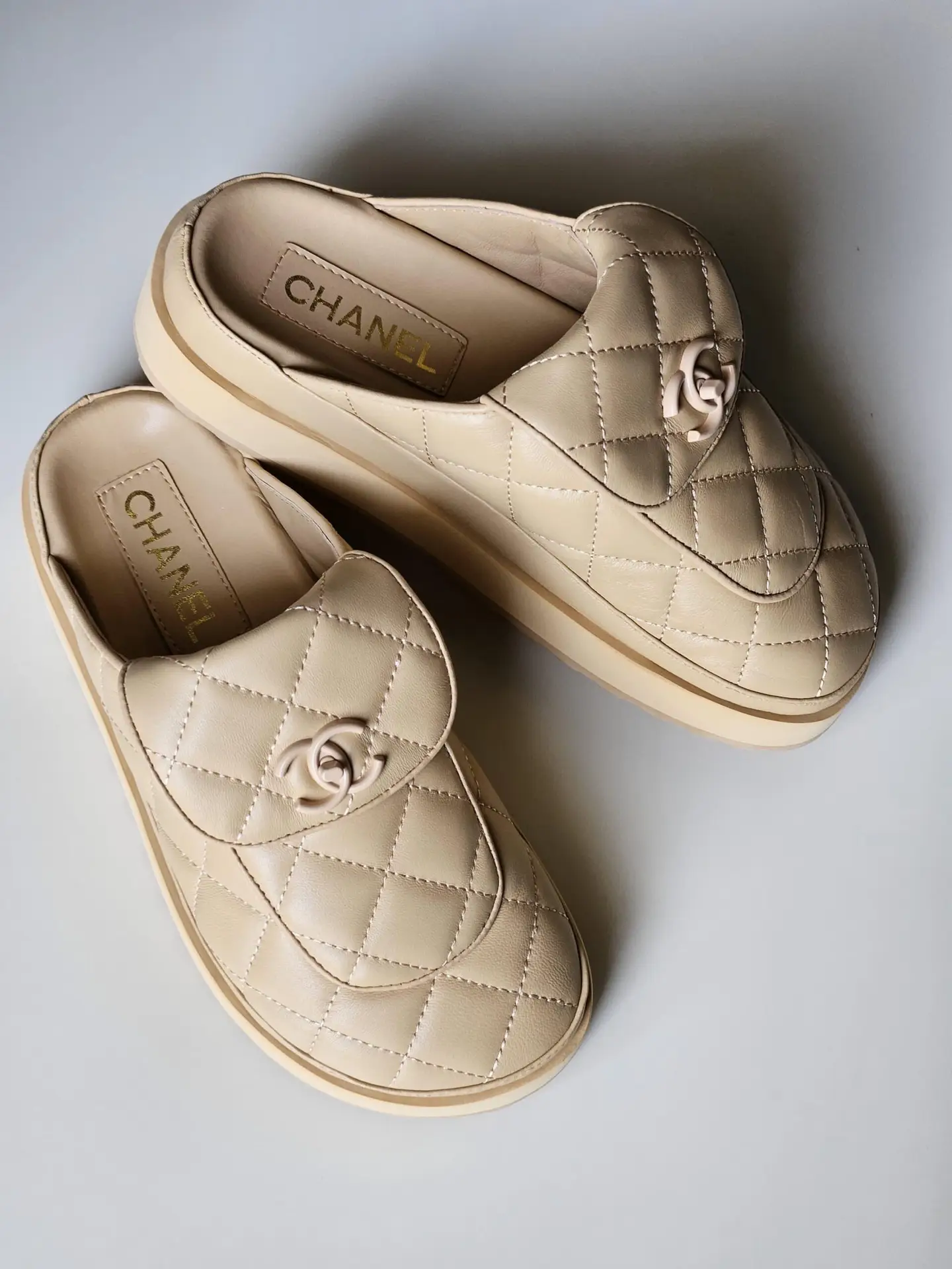 The iconic design features the timeless CHANEL quilted pattern on the insole, a subtle yet powerful statement of the brand’s heritage. The elegant toe box and the perfect slope of the heel provide a flattering silhouette that elongates the leg. Finished with the iconic interlocking CC logo at the vamp, these mules are instantly recognizable and eternally chic.