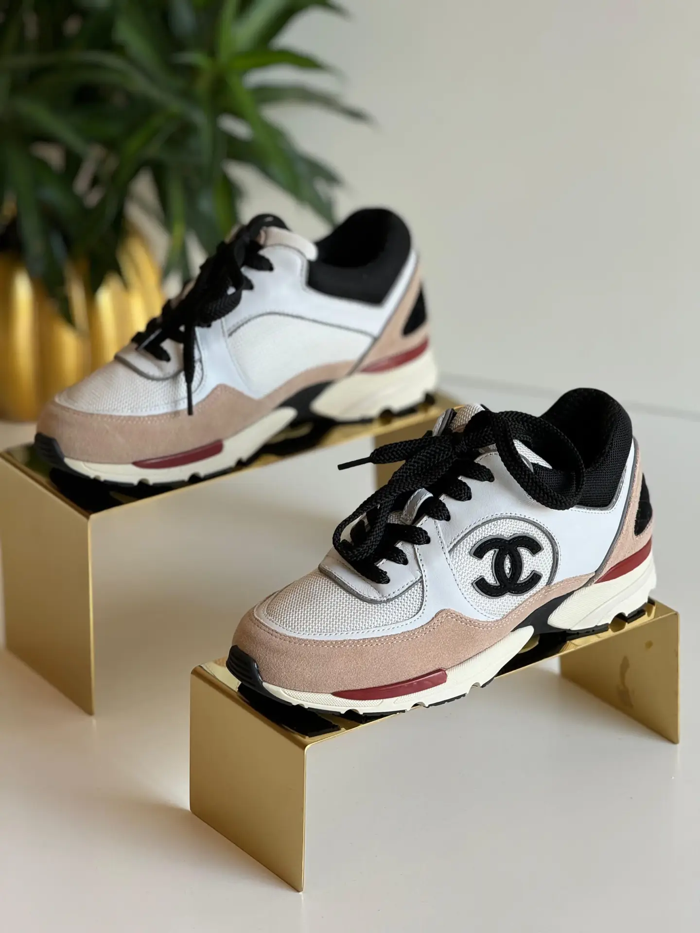 Embody the pinnacle of luxury sportswear with the CHANEL Signature CC Logo Sneaker, an exquisite representation of super master craftsmanship. Meticulously crafted from the finest supple lambskin and durable canvas, this iconic silhouette features the timeless interlocking CC logo elegantly displayed on the vamp and heel. Every stitch, every curve, and every material choice reflects the unparalleled attention to detail synonymous with the House of CHANEL.