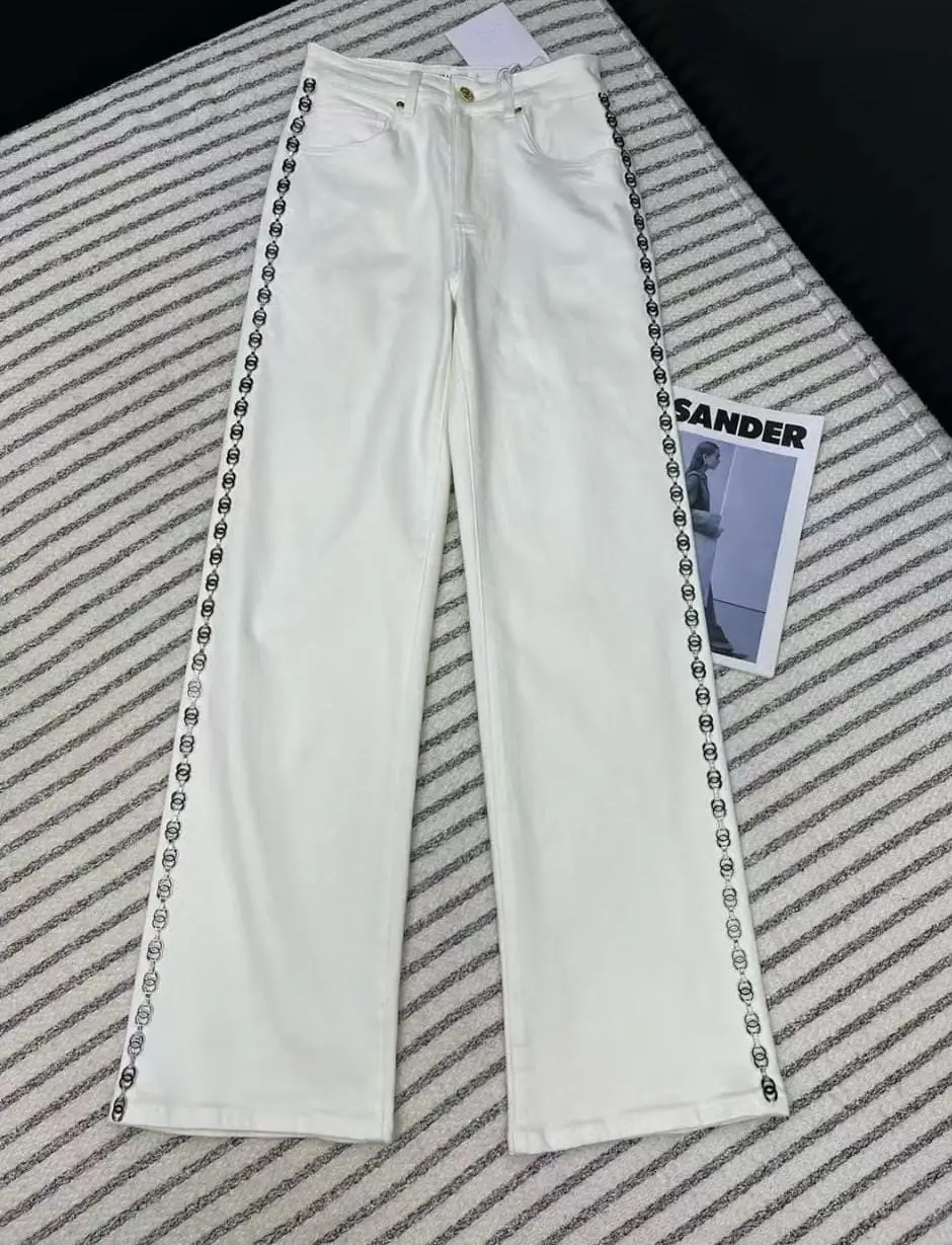 Elevate your wardrobe with the CHANEL Women’s Baggy White Jeans, a perfect blend of high fashion and effortless style. Crafted from premium-quality cotton, these jeans offer a relaxed, baggy fit for ultimate comfort while maintaining a chic, sophisticated look. The intricate embroidery detailing adds a touch of elegance, making these jeans a standout piece in any collection.