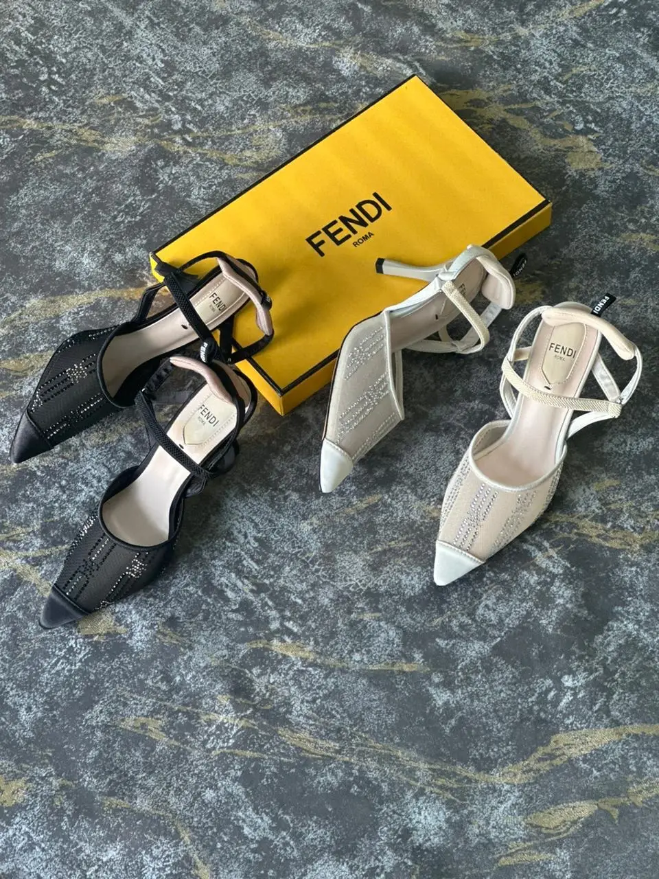 Crafted from an innovative micromesh material, the upper offers a sleek, second-skin fit that is remarkably soft and breathable. The minimalist slingback strap ensures a secure and comfortable embrace for the heel, allowing for effortless wear. Finished with the iconic FENDI Roma logo discreetly placed at the vamp, these slingbacks are a whisper of luxury for the discerning connoisseur. Step into a world of sophisticated comfort and bold design—a perfect harmony of art and footwear.