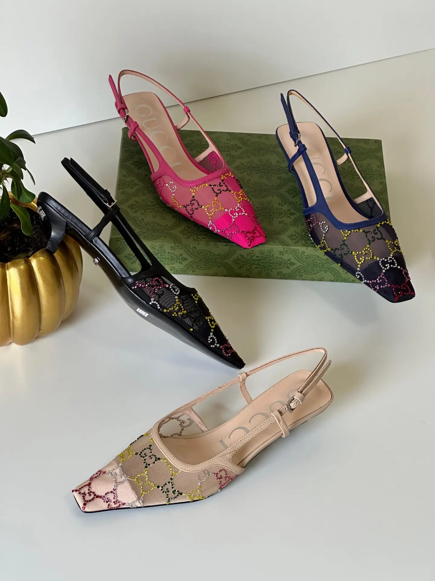 Embody the pinnacle of Italian luxury with the GUCCI Crystal Slingback, a masterpiece where iconic design meets breathtaking artistry. This slingback heel is an undeniable statement piece, meticulously crafted for the discerning individual who commands attention.