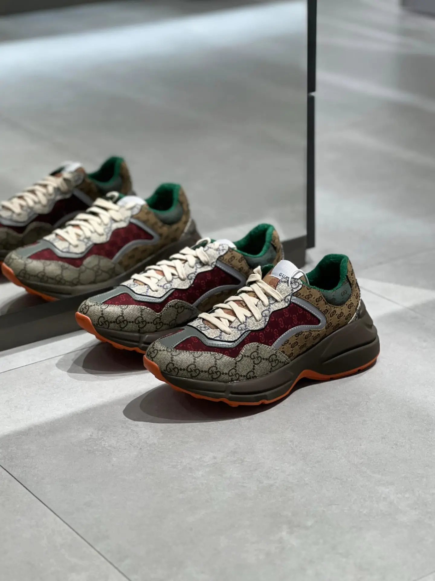 The GUCCI Rhyton sneaker embodies retro-inspired luxury with its bulky construction and thick rubber sole. Crafted from premium ivory calf leather, it features a distinctive vintage Gucci logo print inspired by 1980s archives. The sneaker includes a signature GG logo tag at the tongue and a debossed Gucci logo at the back sole for authentic branding. Designed for comfort and style, it boasts a leather lining, low heel, and 50mm height. As a testament to Gucci’s commitment to quality, this sneaker is meticulously made in Italy and comes with care instructions to ensure longevity. Perfect for those seeking a blend of nostalgia and contemporary fashion.