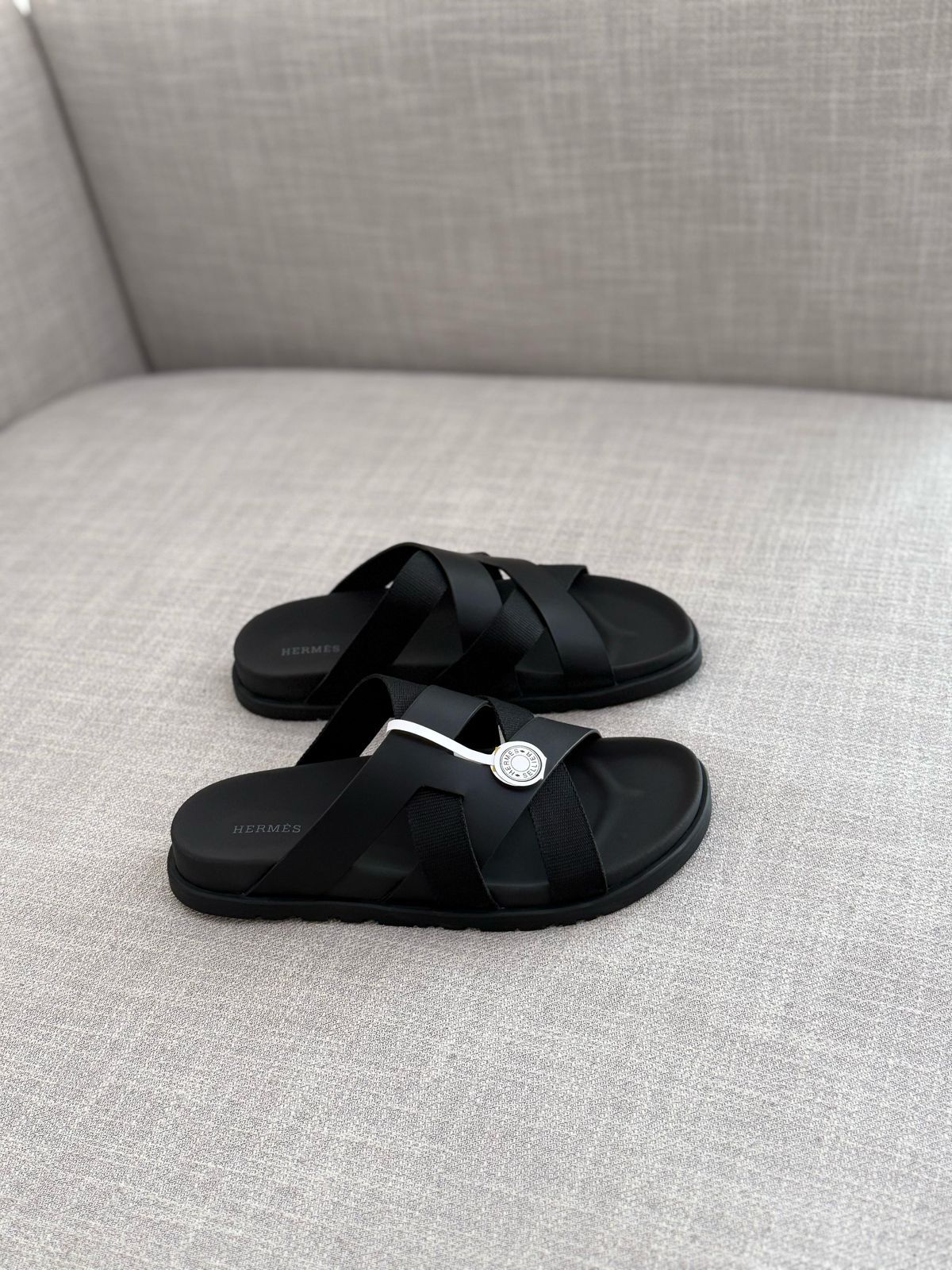 Step into luxury with the HERMES Men’s Black Interlocking Slipper, crafted with impeccable precision and superior materials. Designed for comfort and sophistication, these slippers feature the iconic Interlocking “H” motif, symbolizing timeless elegance. The premium black leather upper ensures durability, while the soft cushioned insole provides all-day comfort. The rubber outsole offers excellent traction, making them perfect for both indoor relaxation and outdoor strolls. A must-have for the modern gentleman who values refined style and unmatched quality.