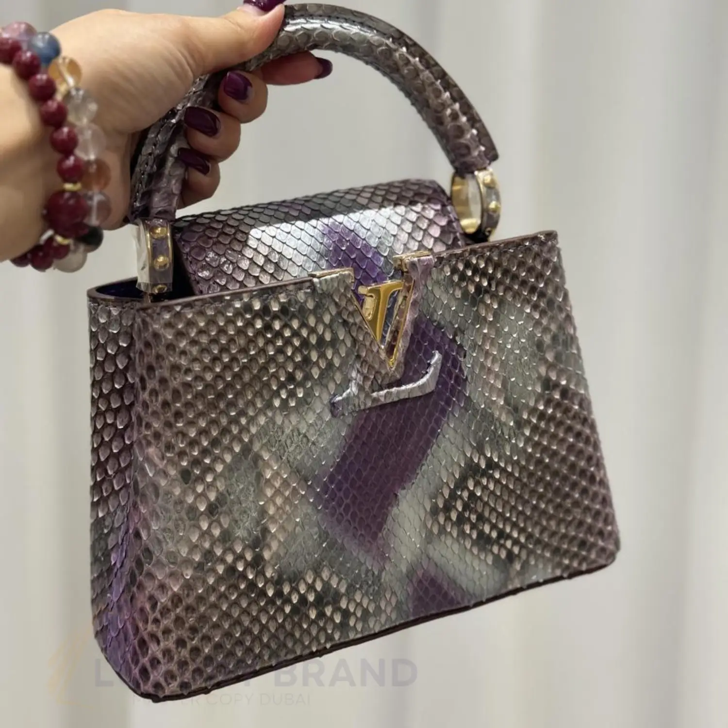 The LOUIS VUITTON Capucines Mini Bag in Blue Python Leather is an exquisite masterpiece of luxury craftsmanship. Made from rare blue python leather, this bag boasts a striking, iridescent finish that exudes opulence. The iconic Capucines silhouette features refined lines, a structured shape, and the signature LV initial plaque discreetly tucked on the front. The top handle and removable shoulder strap offer versatile carrying options, while the polished gold-tone hardware enhances its elegance. Inside, the soft microfiber-lined interior provides ample space for essentials. A true collector’s piece, this super master quality replica ensures every detail mirrors the original, from the precise stitching to the authentic branding.