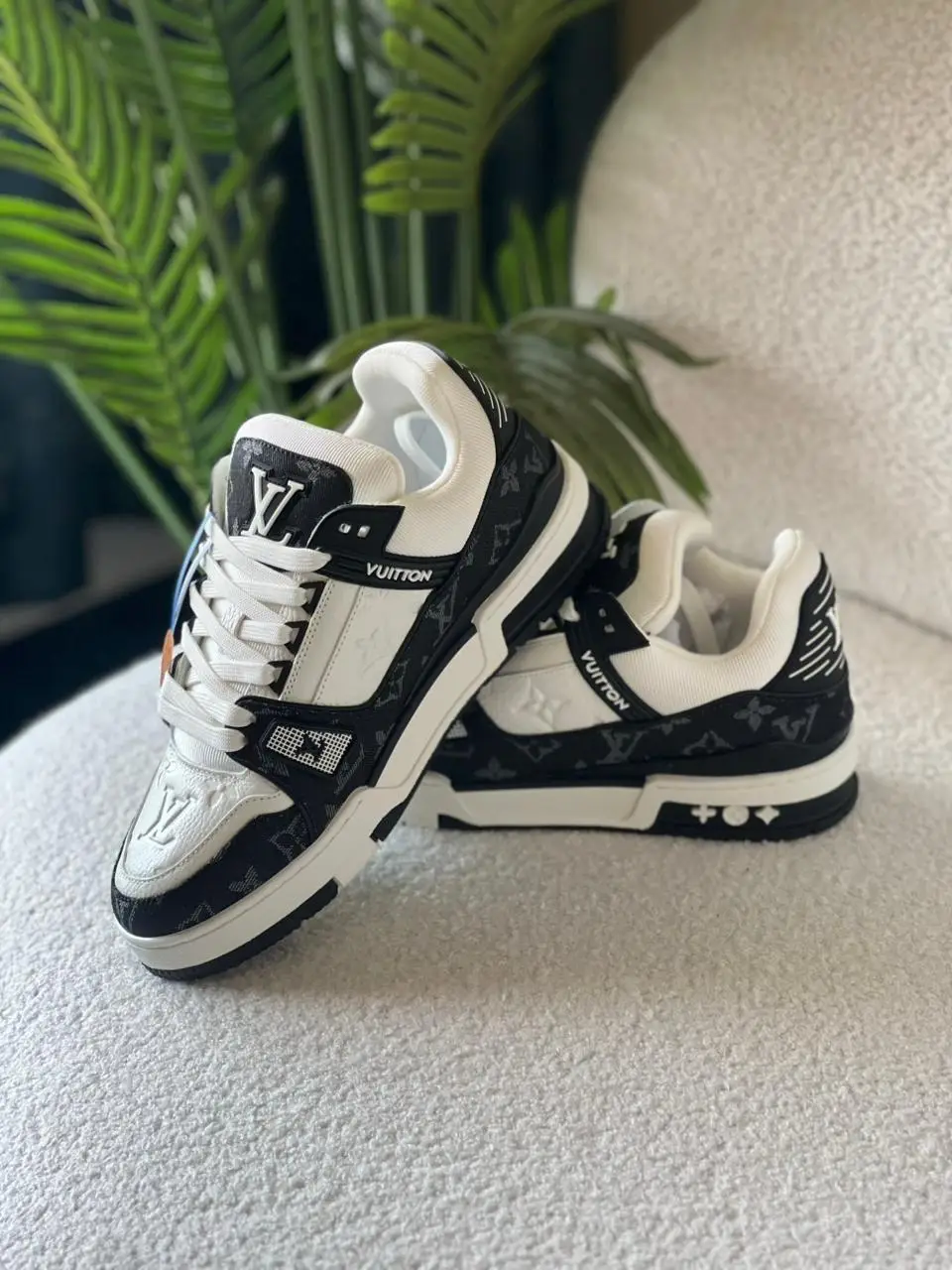 Elevate your streetwear game with the Louis Vuitton Trainer Black & White Sneakers, crafted in super master quality for unmatched luxury and comfort. These high-end sneakers feature a premium leather and mesh upper, accented with Louis Vuitton’s iconic monogram detailing and bold branding on the tongue and heel. The chunky silhouette offers a modern, fashion-forward aesthetic, while the cushioned insole and rubber outsole ensure all-day comfort. Perfect for sneaker enthusiasts and luxury collectors, these LV Trainers are a must-have for any stylish wardrobe.