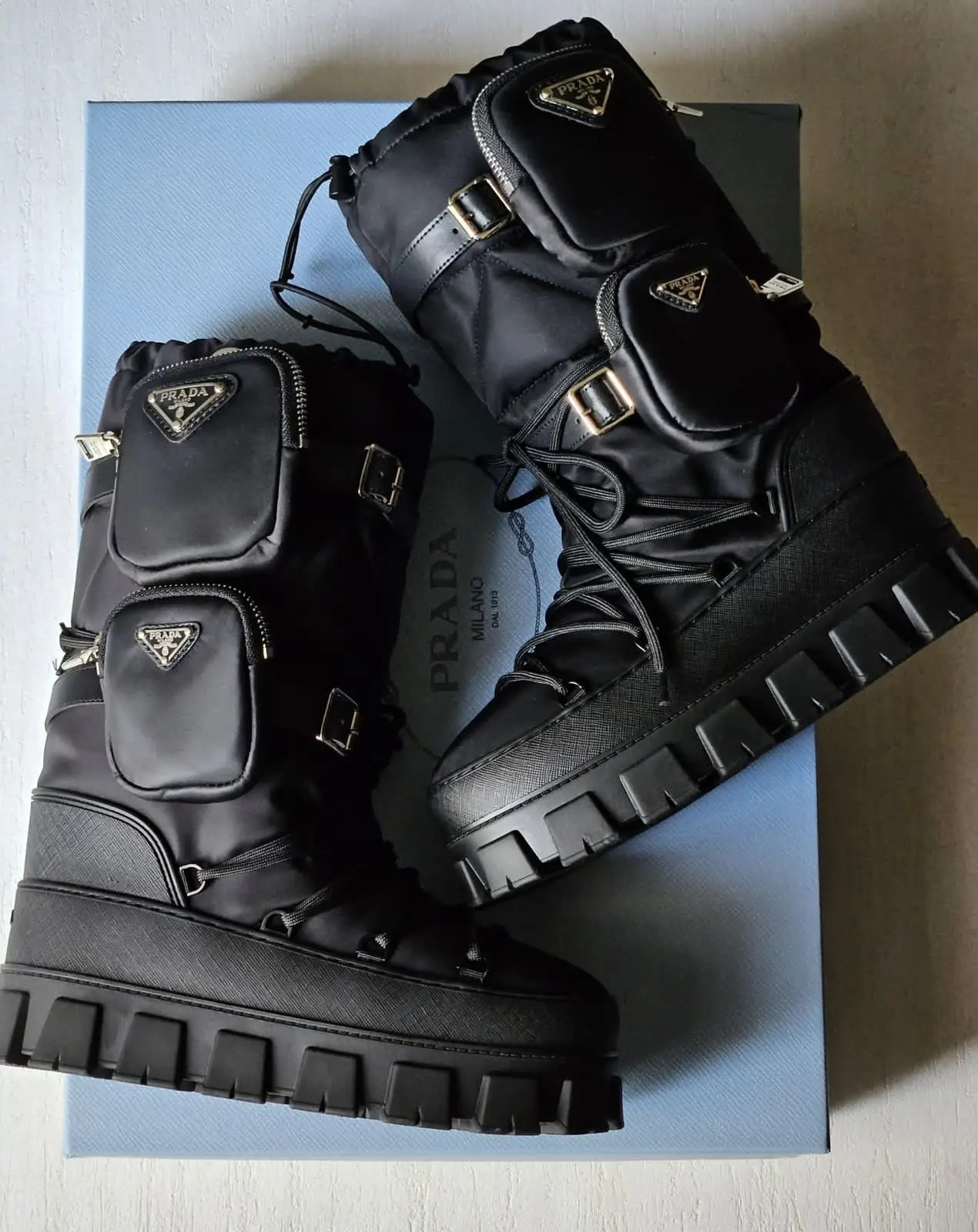 The design features the iconic Prada triangle logo plaque, subtly placed to signify its authentic heritage. From the robust, precision-engineered sole that offers unparalleled comfort and durability to the immaculate stitching and flawless finishing, every detail is meticulously considered. Whether crafted in a classic black, a bold seasonal color, or a sophisticated pattern, these boots are designed to transcend trends.