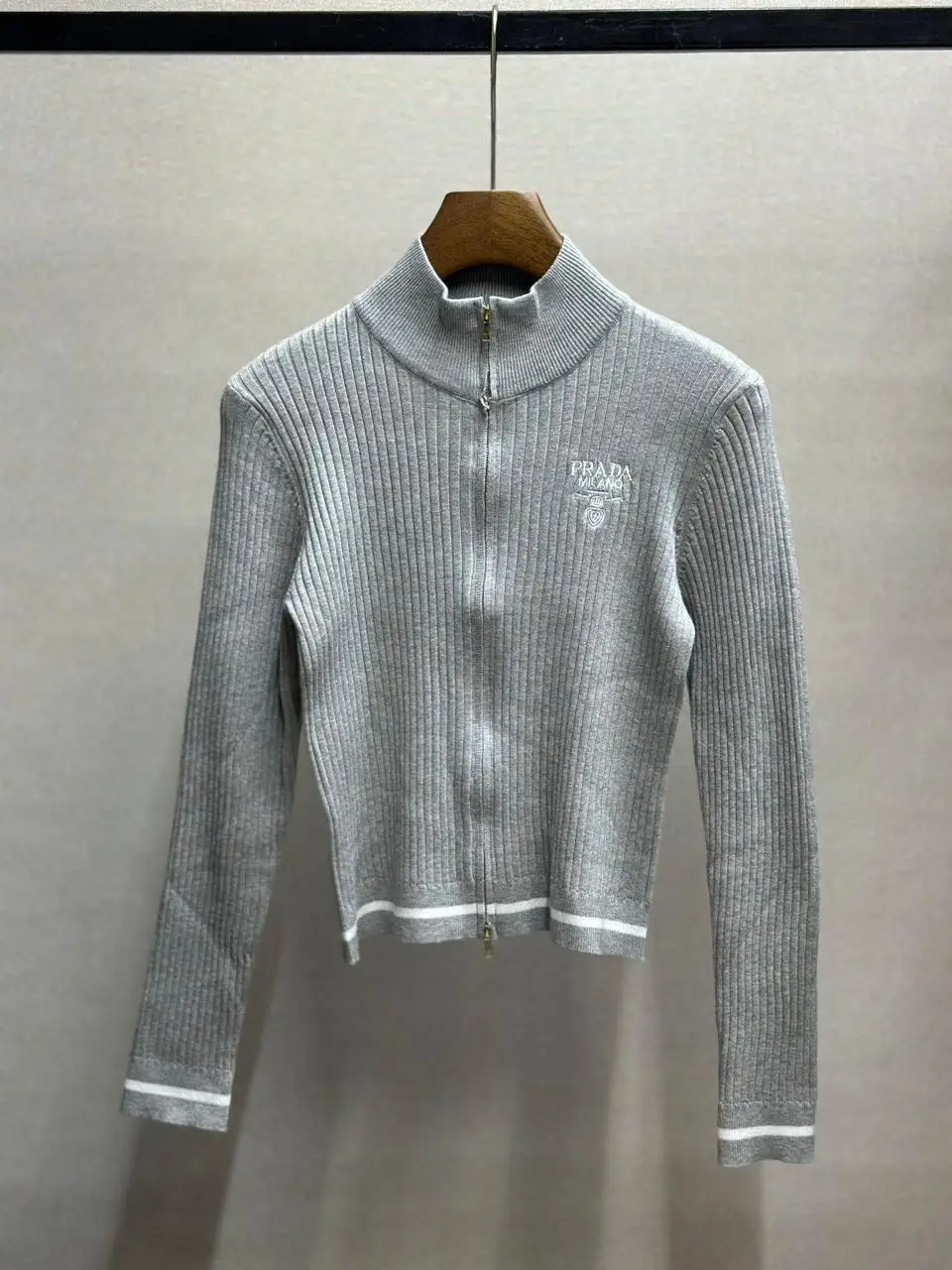 The defining feature is its striking double-zip front, finished with iconic PRADA enameled metal hardware. This functional detail allows for customizable styling—wear it fully zipped for a sleek, high-neck look or partially unzipped for a modern, edgy appeal. The skinny ribbed fabric and cropped silhouette are designed to pair seamlessly with high-waisted trousers, skirts, or tailored shorts, creating an elevated foundation for any contemporary wardrobe.
