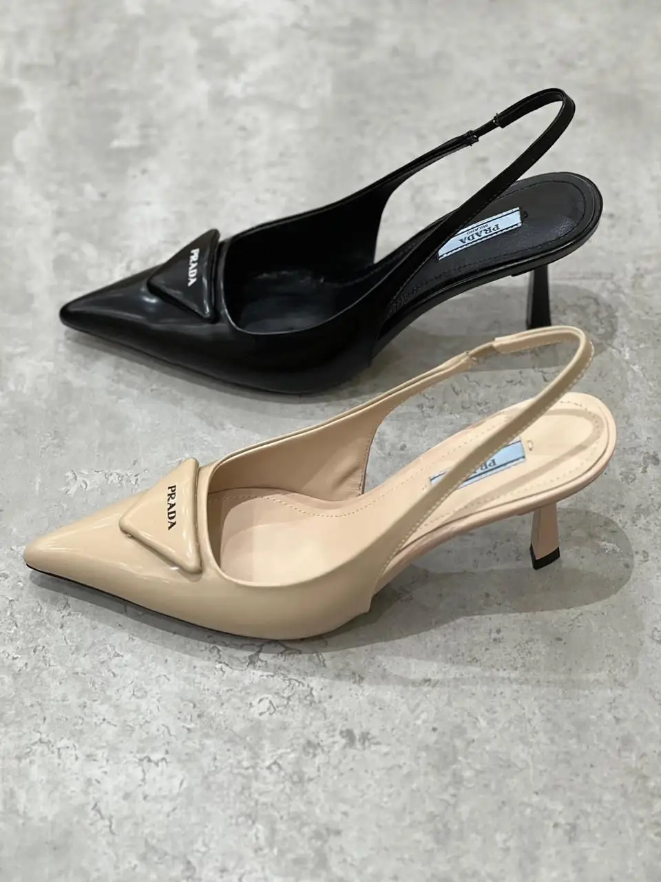 The iconic PRADA Slingback Pumps, featuring the signature triangular logo and a sculpted stiletto heel. Masterfully crafted in Italy for unparalleled elegance and a flawless fit.