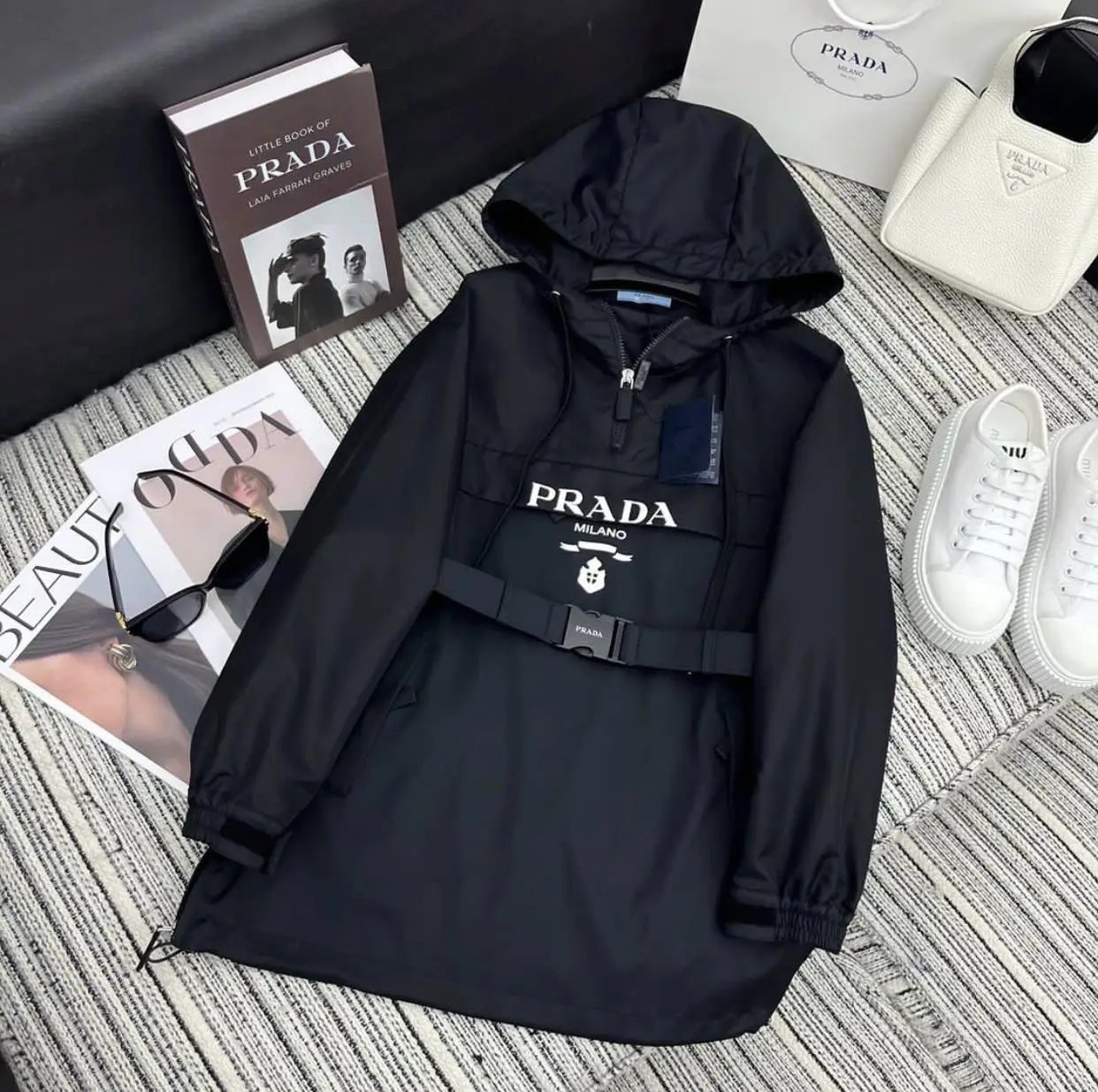 Embody the zenith of modern luxury with the PRADA Technical Fabric Long Coat. This masterpiece is not merely a coat; it is a statement of architectural precision and avant-garde design, engineered for the discerning individual who commands respect. Crafted from PRADA’s exclusive high-performance technical fabric, the coat offers a meticulously refined matte finish that repels the elements while presenting an impeccably sharp silhouette.