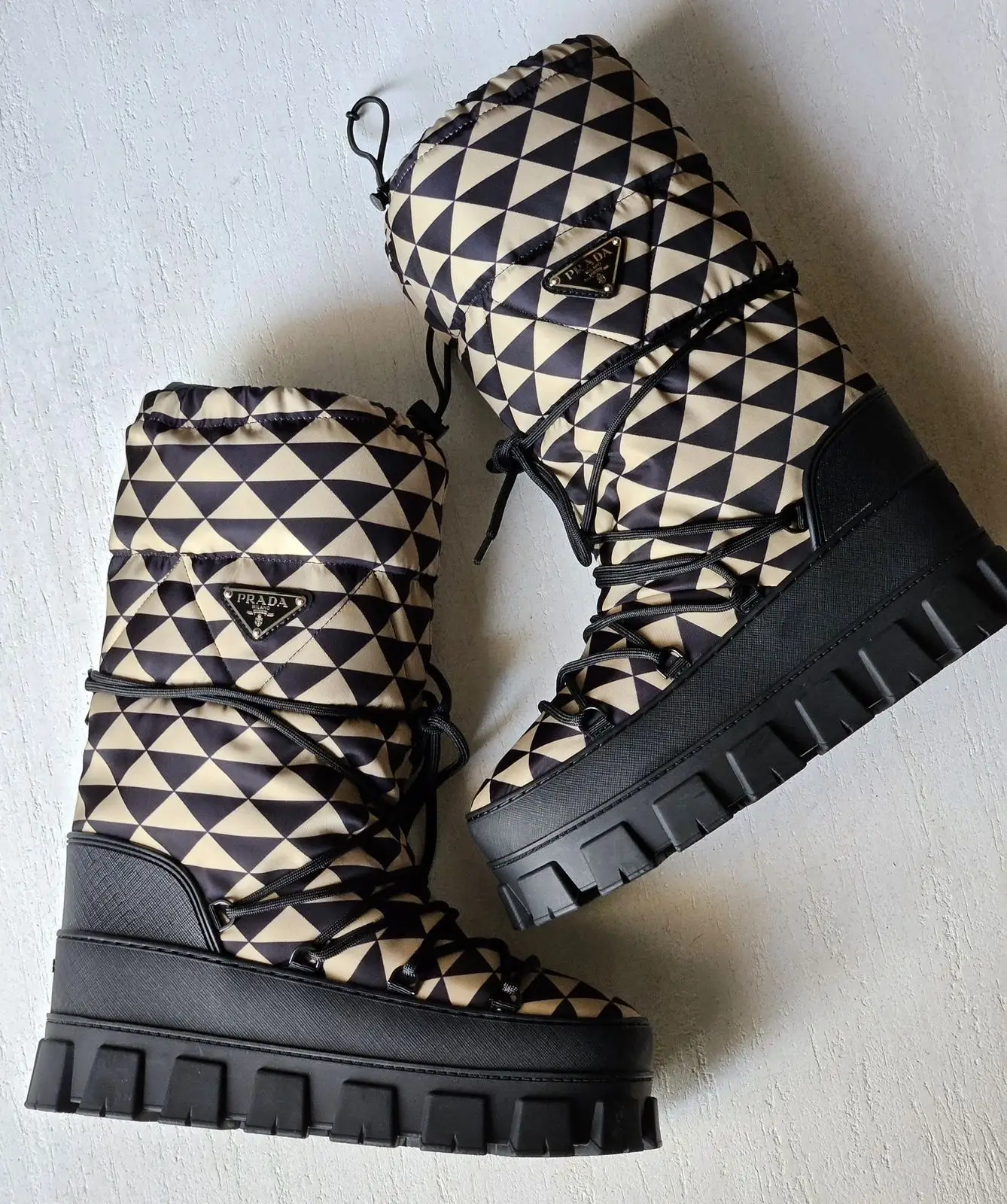 Embody the zenith of Italian luxury with the PRADA Triangle Logo Padded Leather Ankle Boots. A contemporary icon, this boot redefines urban elegance through its masterful blend of architectural design and plush comfort. The defining feature is the instantly recognizable padded cuff, meticulously crafted to echo the lines of the iconic Triangle logo plaque, which sits proudly at the ankle. This harmonious detail creates a sophisticated, high-fashion silhouette that elevates any ensemble.