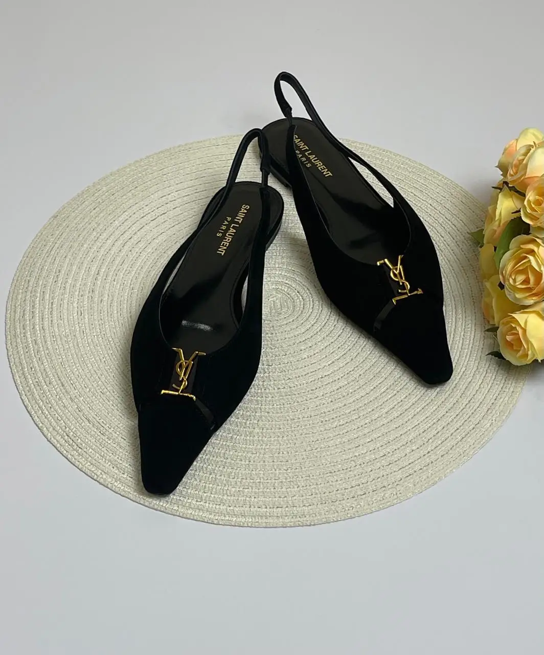 The elegantly sloped toe and sculpted 65mm heel create a flattering silhouette that elongates the leg with effortless grace. The defining feature—a sleek, contrasting enameled YSL logo meticulously set on the slingback strap—serves as a bold yet refined signature of the House of Saint Laurent.